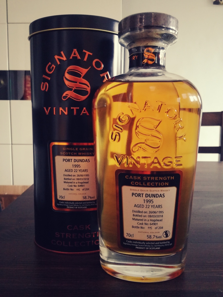 Signatory VintageChose promise, chose due, voici les notes de dégustation du Port Dundas 1995 (Signatory Vintage 22yo – 58.7% – distillerie fermée) avec un profil totalement différent des derniers whiskies présentés sur ce blog. Et totalement différent de beaucoup d’autres whiskies tant il est étonnement atypique. Ce whisky m’a révélé bien des surprises, je ne m’attendais absolument pas à cela, spécialement avec un single grain…