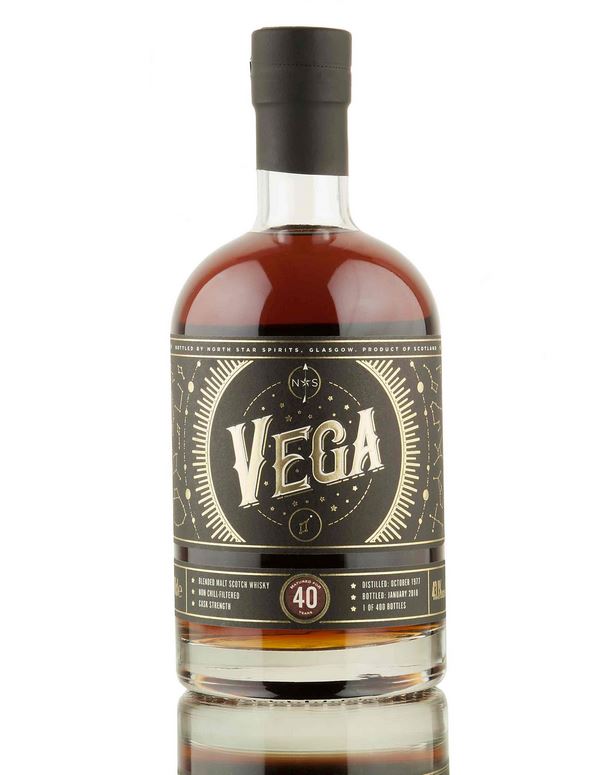 North Star Spirits est un embouteilleur indépendant qui s’est lancé dans le whisky en 2016 seulement mais qui a déjà acquis une belle réputation, notamment grâce à sa série Vega dont je vais ici vous présenter le second joli bébé, à savoir le Vega 40yo (43.1% – 2018). Après un blend de 23 ans d’âge d’excellente facture, ce blend de 40 ans d’âge était fortement attendu! Non seulement parce que les amateurs étaient en droit d’espérer pouvoir goûter un whisky de qualité encore supérieure mais aussi du fait des tarifs incroyablement bas auxquels leurs bouteilles sont proposées. Et ca n’a pas loupé, tant pour le tarif que pour la qualité de ce whisky. On voit ca avec les notes 😀